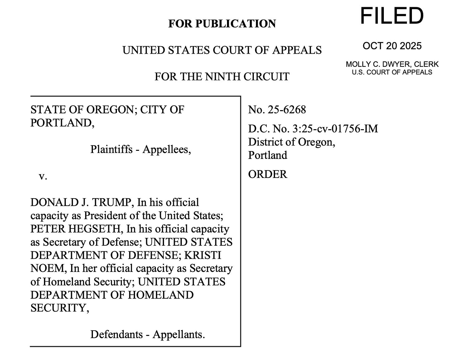 The order is a stay of the temporary restraining order federalizing the Oregon National Guard that was issued by U.S. District Judge Karin Immergut, a Trump appointee, on October 4 and extended on October 15 for an additional 14 days.