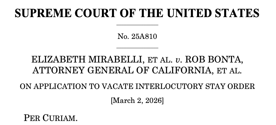 In Mirabelli v. Bonta, the conservative justices allowed a district-court injunction to go back into effect during litigation that blocks California schools from preventing parents from being told about their children’s gender presentation, name, or pronouns. The challenged policy requires a student’s consent for a teacher to do so.