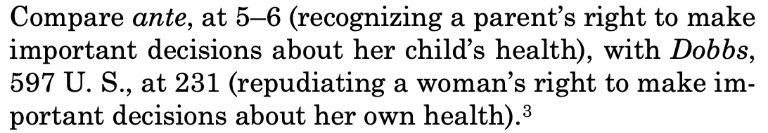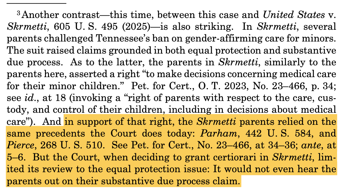 Then, in a footnote, Kagan provides one last lowlight — addressing the discordance between Monday’s order and the June 2025 decision in U.S. v. Skrmetti, upholding Tennessee’s ban on gender-affirming medical care for minors:
