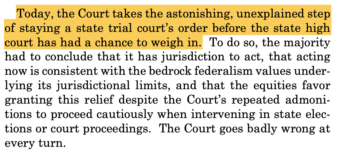 Justice Sonia Sotomayor detailed those concerns in her dissent, joined by Justices Elena Kagan and Ketanji Brown Jackson. Beginning, “The Court’s 101-word unexplained order can be summarized in just 7: ‘Rules for thee, but not for me,’“ the dissent did not hold back: