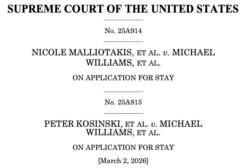 The Supreme Court stayed that order in a one-paragraph order of its own on requests that included Rep. Nicole Malliotakis, the Republican representative of NY-11.