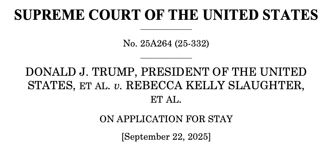 The U.S. Supreme Court’s Republican appointees on Monday issued an order allowing President Donald Trump’s purported firing of Rebecca Slaughter as a Democratic commissioner of the Federal Trade Commission to take effect while litigation proceeds, while also stating that the court would be taking up the Justice Department’s appeal of the case to decide whether a 90-year-old precedent that would bar Trump’s firing of Slaughter should be overturned.