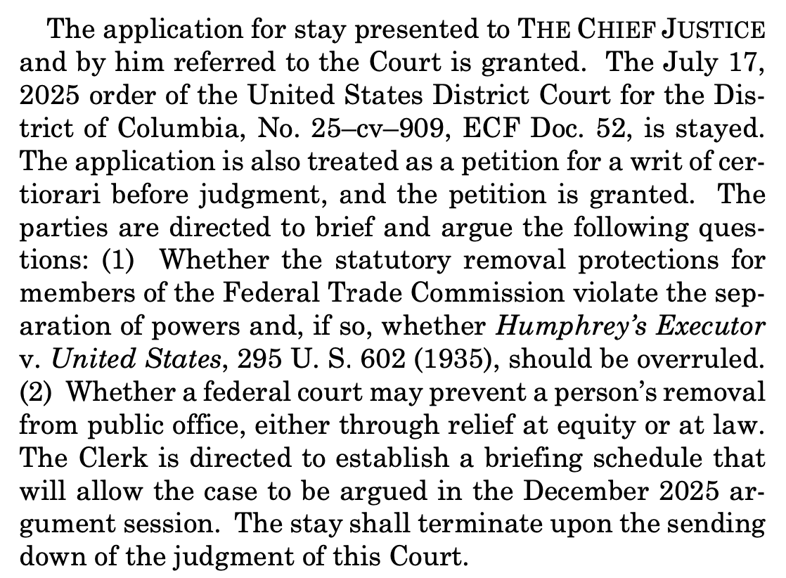 The Republican appointees, over the pointed objection of the Democratic appointees, are allowing Trump’s firing to take effect before the court even “decides” whether Trump’s firing is allowed because the majority, in the future, is (apparently) likely to overturn the 90-year-old Humphrey’s Executor precedent.