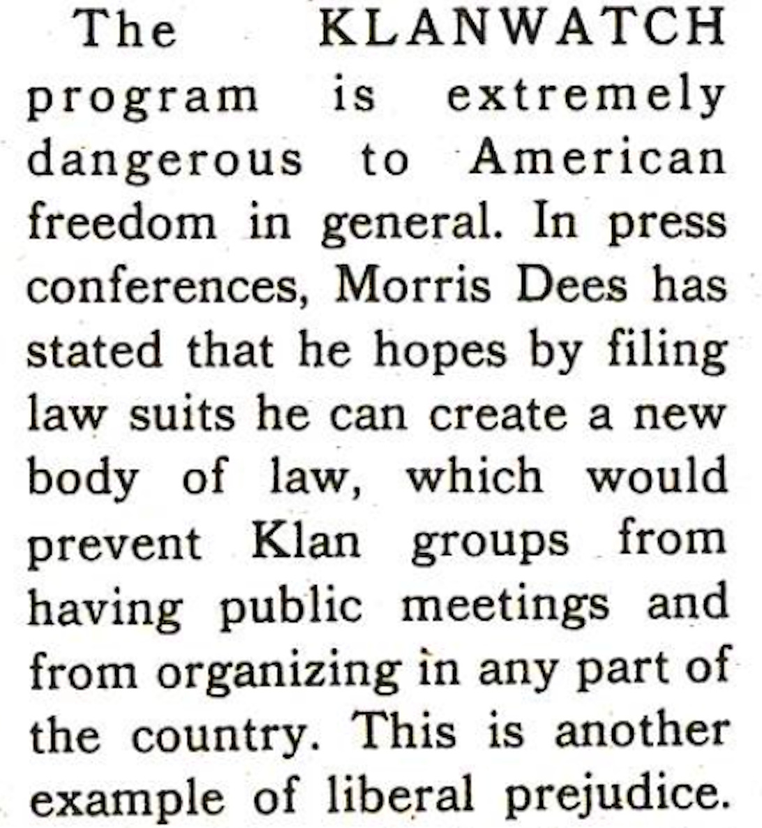 There was no lack of understanding of Klanwatch’s purpose 45 years ago. The Legal Staff of the United Klans of America understood it perfectly: