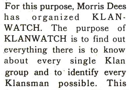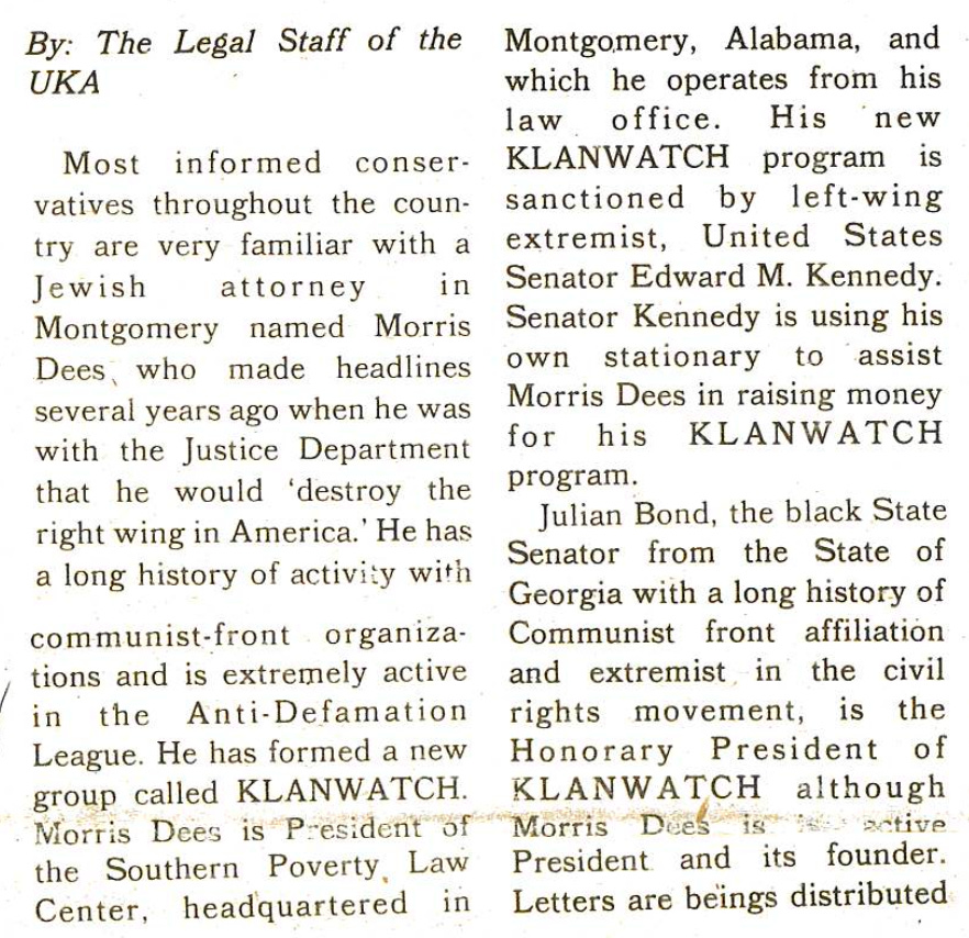 In that 1981 issue of Fiery Cross, “The Legal Staff of the UKA“ described the new Klanwatch effort in the extremely racist terms one would expect of a Klan publication: