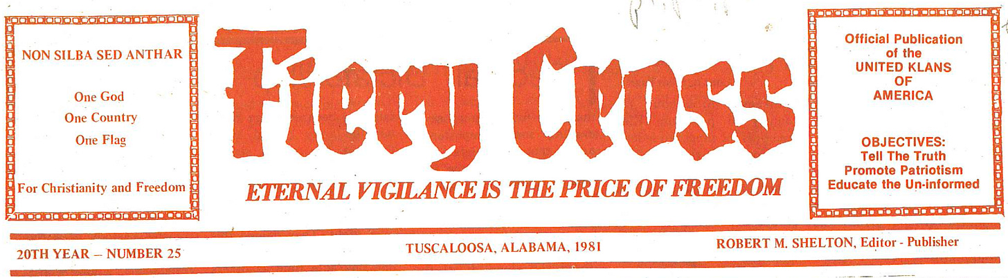 The quotes decrying that program that led tonight’s newsletter came from Fiery Cross, the “Official Publication of the United Klans of America,” a copy of which was provided to Law Dork.