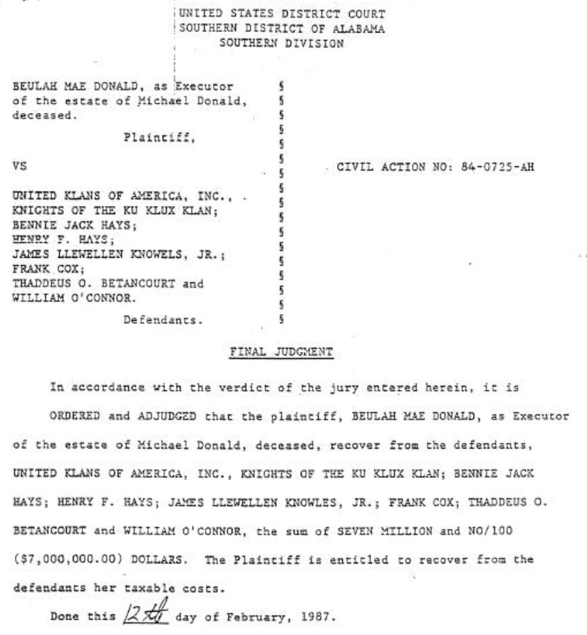 Nearly 40 years ago, the United Klans of America was bankrupted by the judgment in a lawsuit brought by Beulah Mae Donald, the mother of Michael Donald, a 19-year-old lynched by two members of the United Klans.