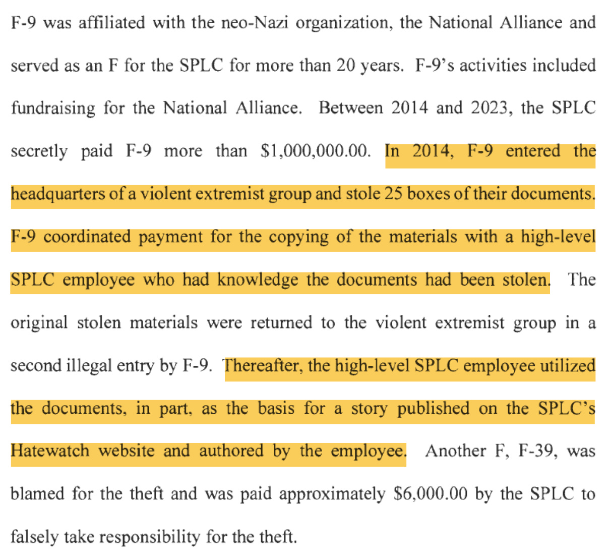 The indictment alleged that through its prior use of paid informants within extremist organizations — called field sources (or “Fs”) by the SPLC — the organization committed wire fraud (six counts) because donors weren’t aware of a program that the indictment itself acknowledges “[s]tart[ed] in the 1980s.”