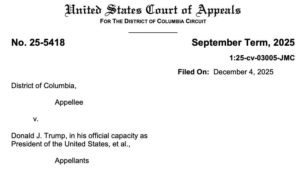 The Dem appointees dissent in the racial gerrymandering case. Also: A D.C. Circuit "administrative stay" means National Guard can remain deployed in D.C. for now.