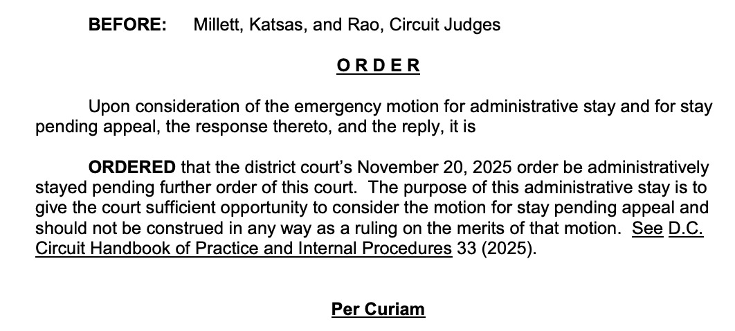 The temporary order — an “administrative stay” — blocks U.S. District Judge Jia Cobb’s November 20 preliminary injunction while the appeals court considers the Justice Department’s request for a stay pending the appeal of Cobb’s ruling.