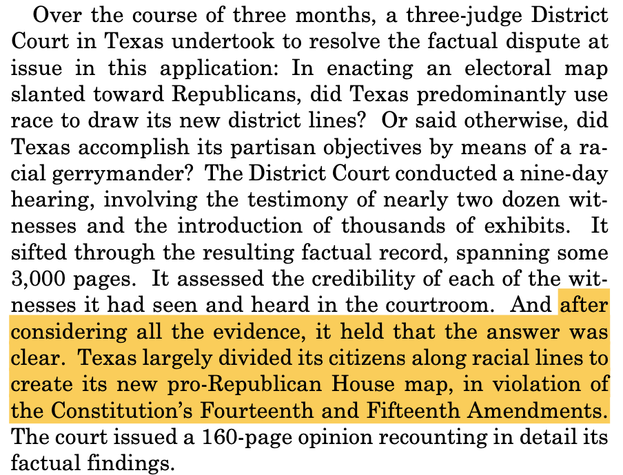 Noting that the Supreme Court’s order “disrespects the work of a District Court that did everything one could ask to carry out its charge” and “disserves the millions of Texans whom the District Court found were assigned to their new districts based on their race,” Kagan went on to detail the district court’s actual trial work and legal conclusions regarding the racial gerrymandering claim that is all but ignored by the Supreme Court’s order.