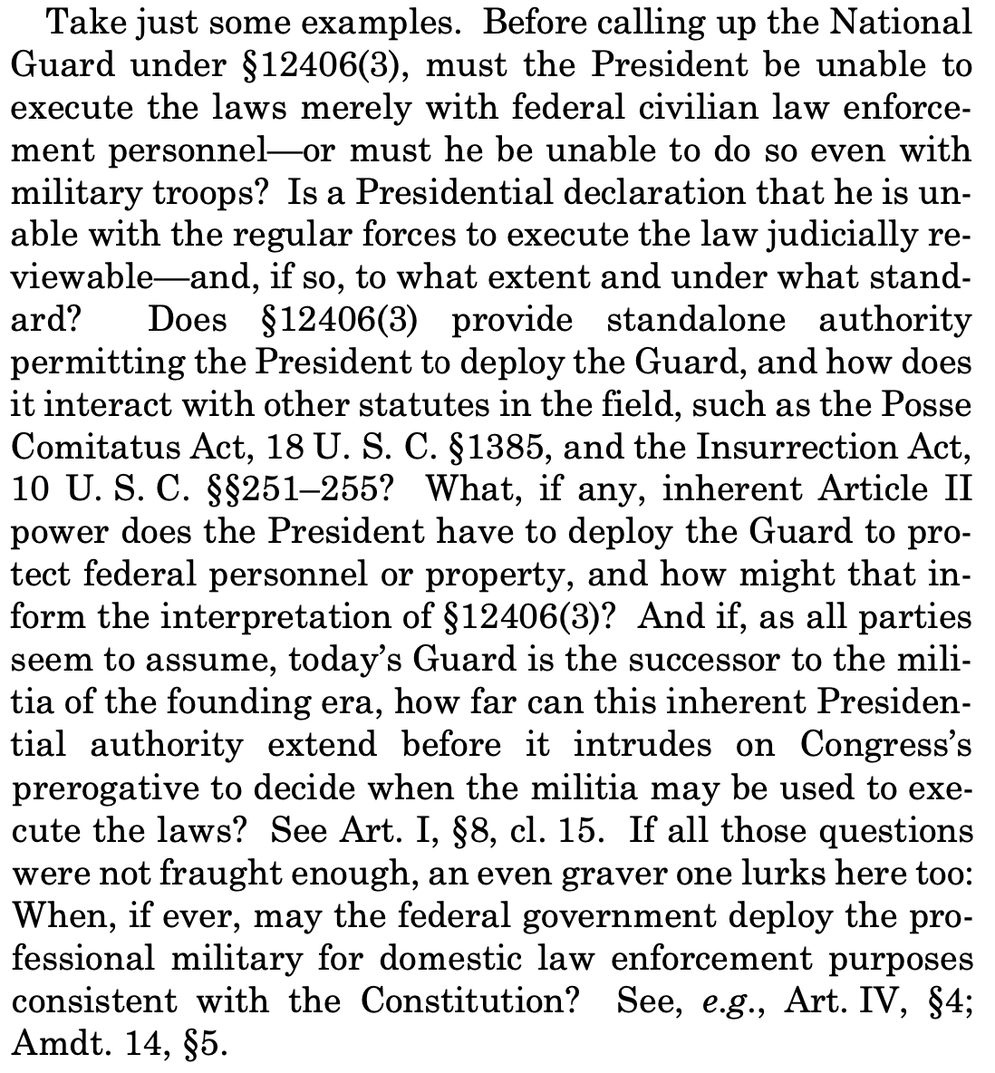 Despite Alito’s claims about party presentation, it should be noted that the “regular forces” question was considered by U.S. District Judge April Perry in her opinion granting the order blocking the National Guard federalization and deployment in Illinois, and DOJ was seeking an order from the Supreme Court staying that order.