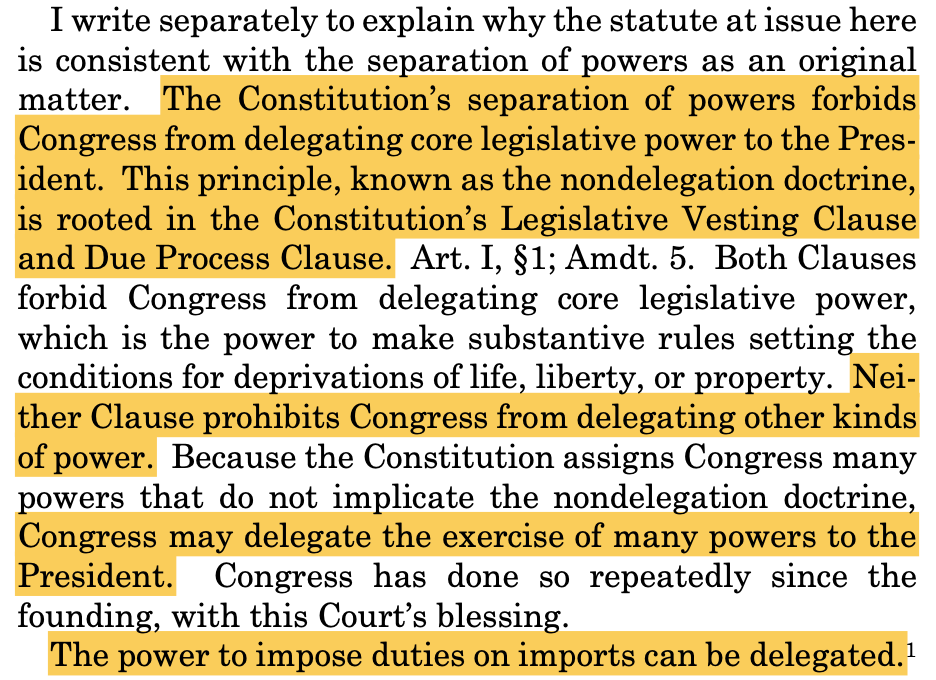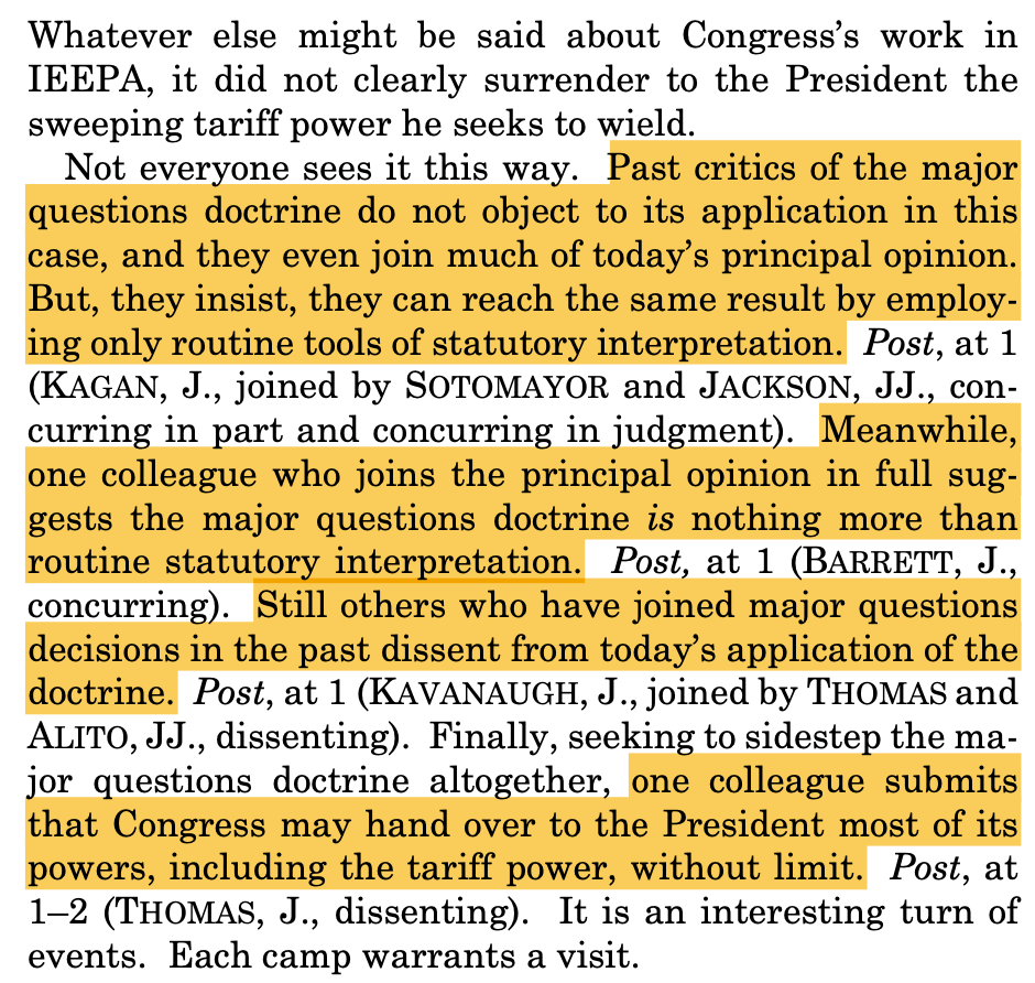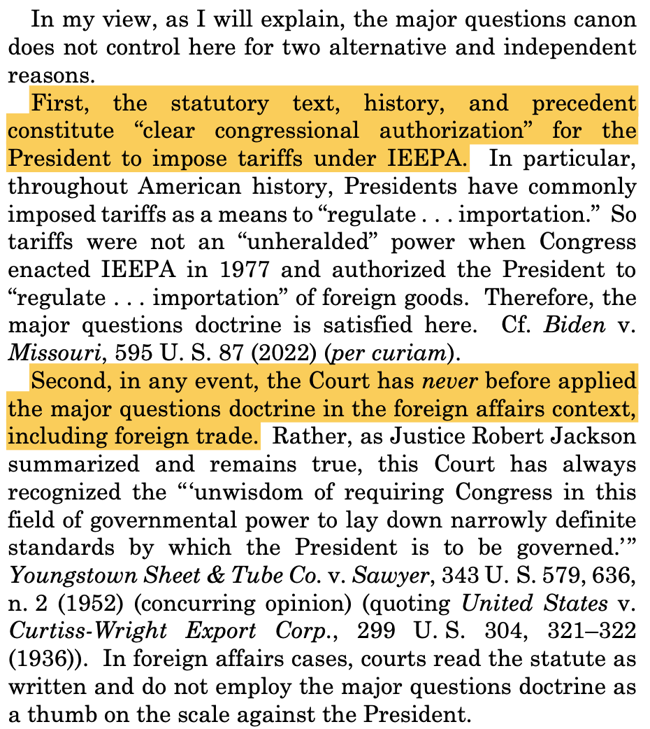 In Kavanaugh’s dissent for himself, Thomas, and Alito, he addressed the broad authority claimed by stating that “IEEPA merely allows the President to impose tariffs somewhat more efficiently to deal with foreign threats during national emergencies.”