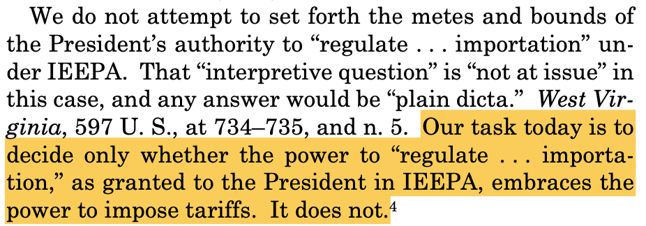 Roberts explained what the court was not deciding — both as to other uses of IEEPA and as to other tariff authorities.