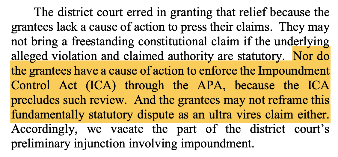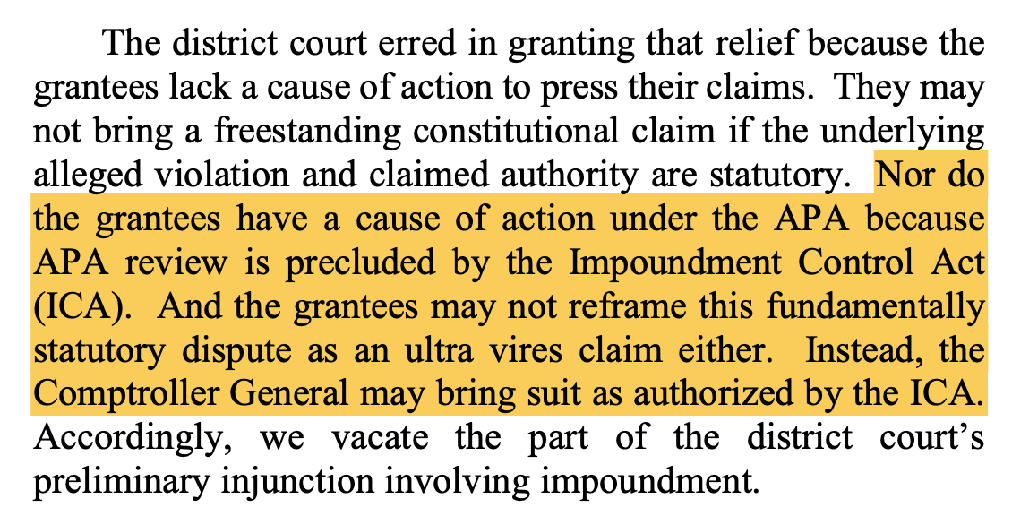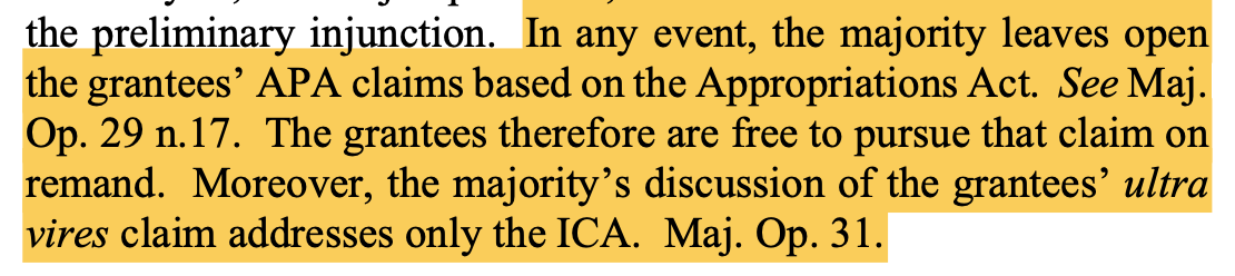 Echoing Garcia’s statement, Pan explained, “An immediate remand for the grantees to litigate claims that the Executive violated the Appropriations Act under the APA or acted ultra vires vis- à-vis the Appropriations Act” — citing to the footnote of her dissent I noted above — “may be the most efficient way for the grantees to seek access to the $15 billion of appropriated funds that are set to expire on September 30.” She also — albeit more aggressively than Garcia — noted the possibility of later en banc review. “[B]ecause the … issue will likely recur, our en banc court may have another opportunity to correct the panel opinion’s erroneous reasoning.” Should that happen, she continued, “we should take the first opportunity to revisit and correct the mistake that the court has made.“