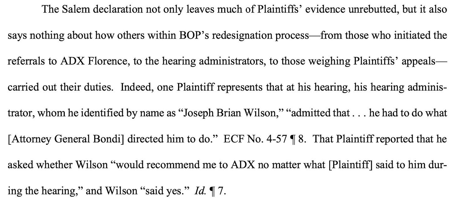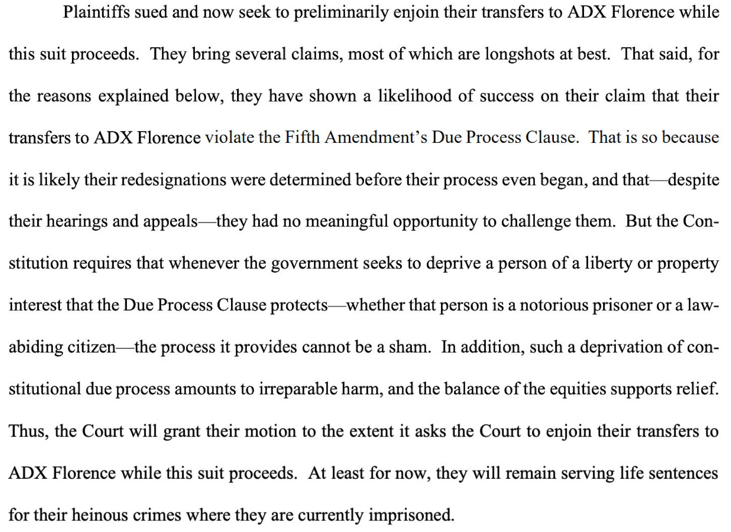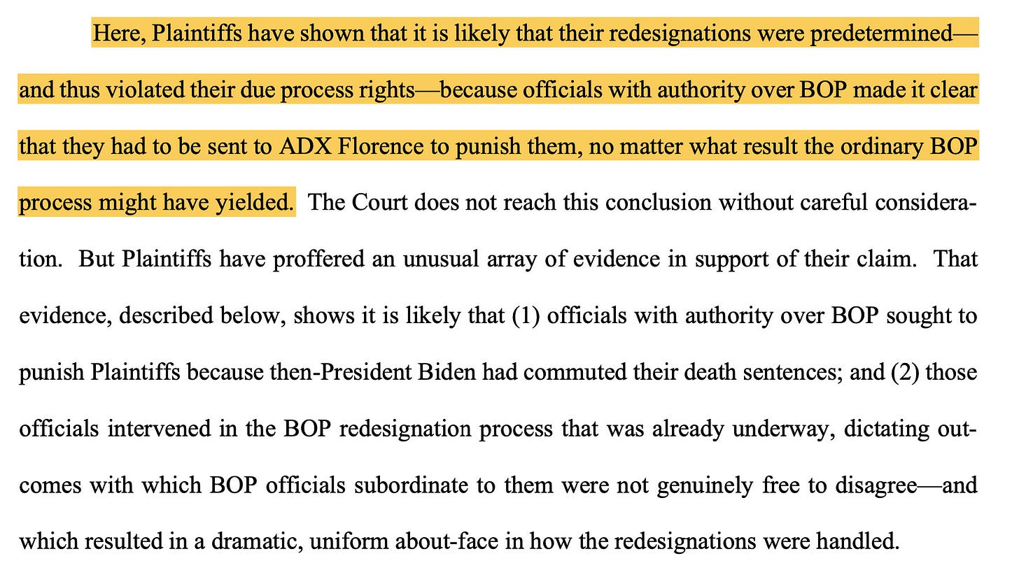 After Biden’s commutations, Trump — as Kelly put it — “lashed out.” Once he became president a month later, he issued an executive order relating to the death penalty that Bondi followed up on when she was confirmed. Ultimately, the Bureau of Prisons was going to transfer those whose sentences were commuted to ADX Florence — which Kelly noted is “[t]he most restrictive prison in the federal system” and is “nicknamed ‘the Alcatraz of the Rockies’” — prompting the lawsuit and the inmates’ February request to stop the transfer. Kelly sided with the inmates.