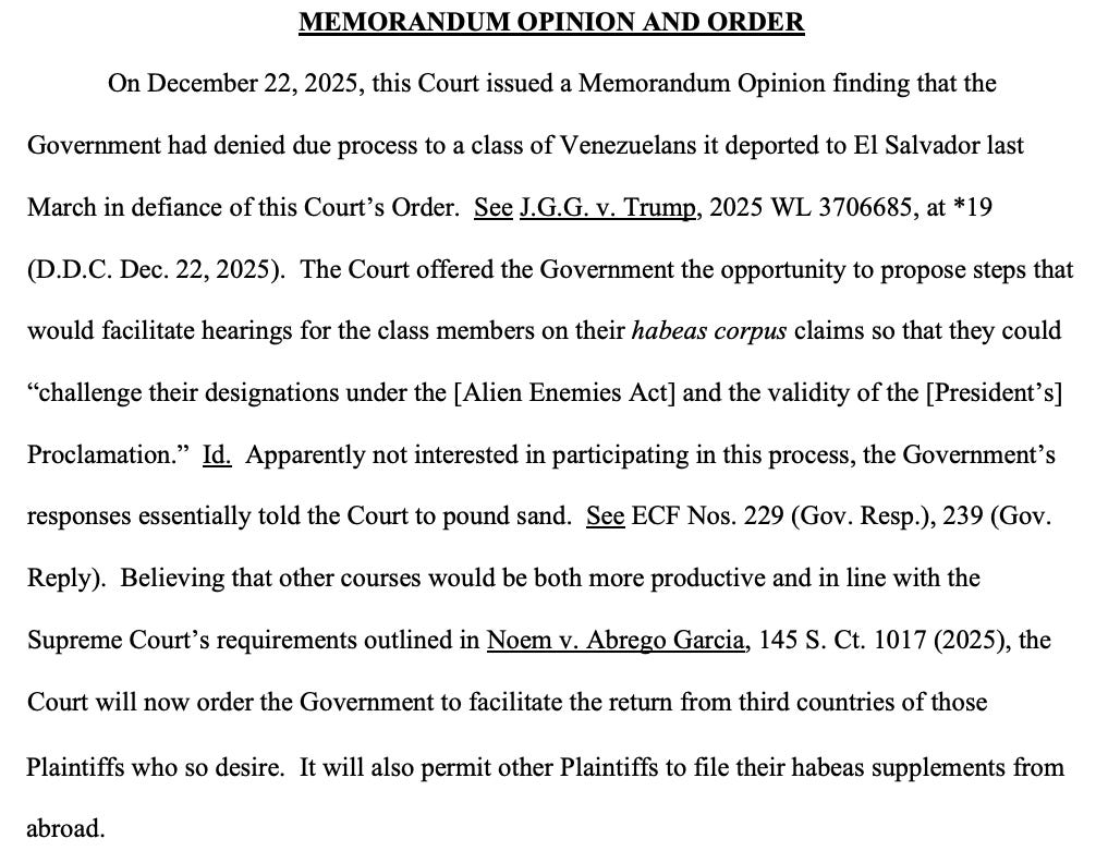 Looking at the U.S. Supreme Court’s statements on the matter — both as to the AEA challenges and in Kilmar Abrego Garcia’s case — Boasberg summarized the rule as “it is up to the Government to remedy the wrong that it perpetrated here and to provide a means for doing so.“
