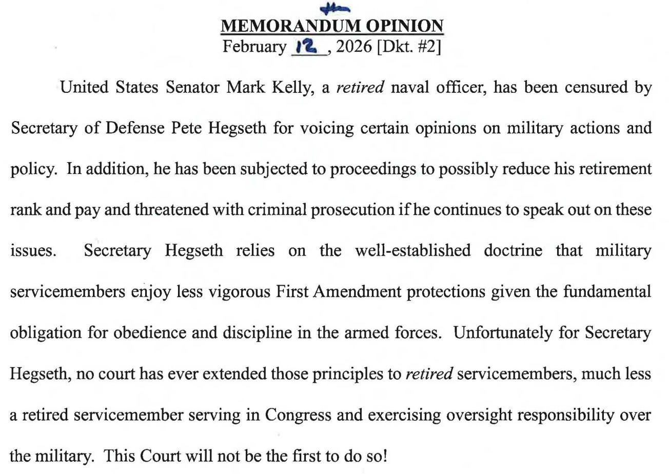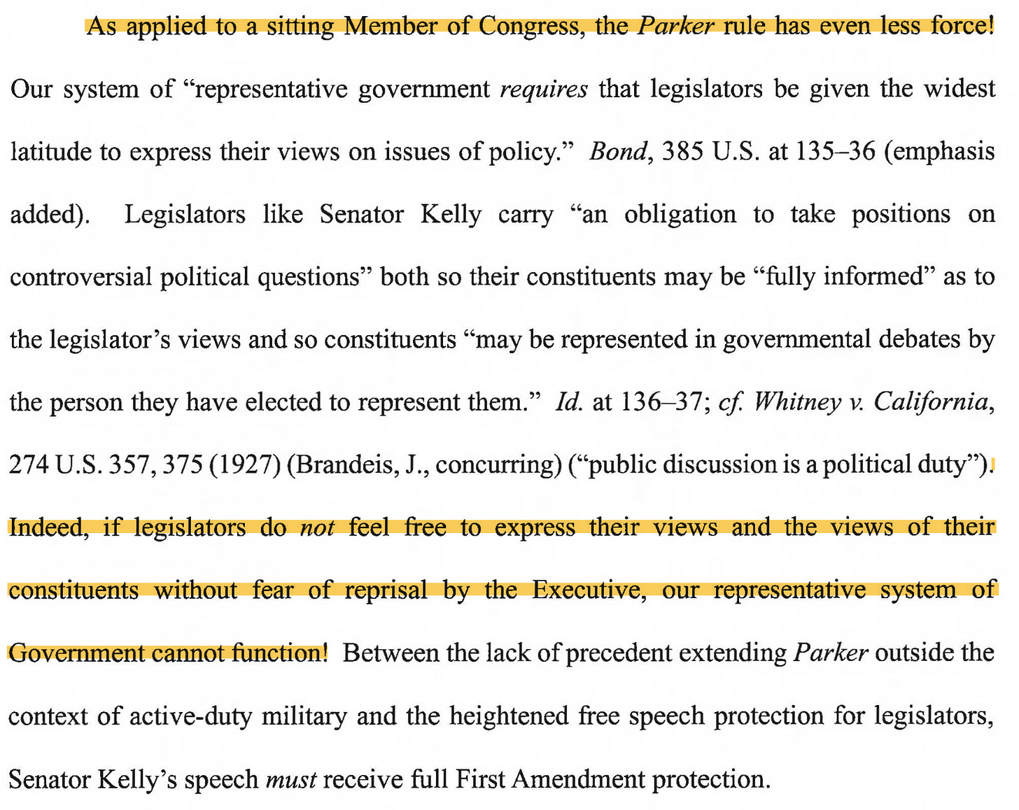 “I disagree,” he wrote. “This Court has all it needs to conclude that Defendants have trampled on Senator Kelly's First Amendment freedoms and threatened the constitutional liberties of millions of military retirees."