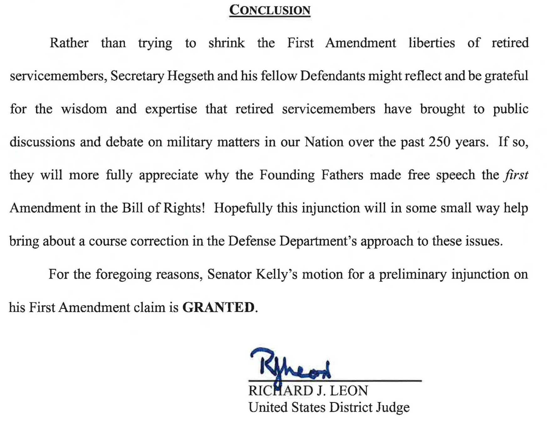 In it, U.S. District Judge Richard Leon — a George W. Bush appointee who was nominated to the federal bench on September 10, 2001 — blocked Defense Secretary Pete Hegseth’s attempt to punish Sen. Mark Kelly for the “illegal orders” video the he and other members of Congress issued this past fall.
