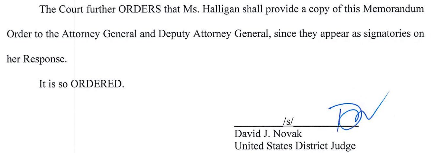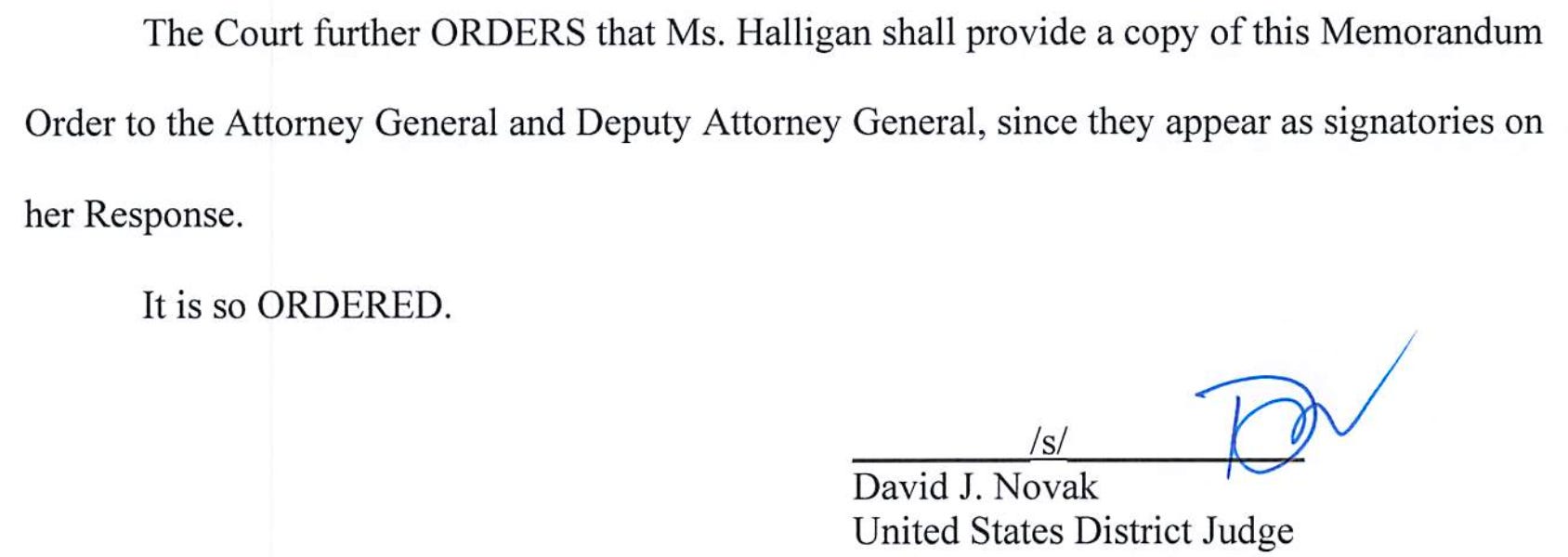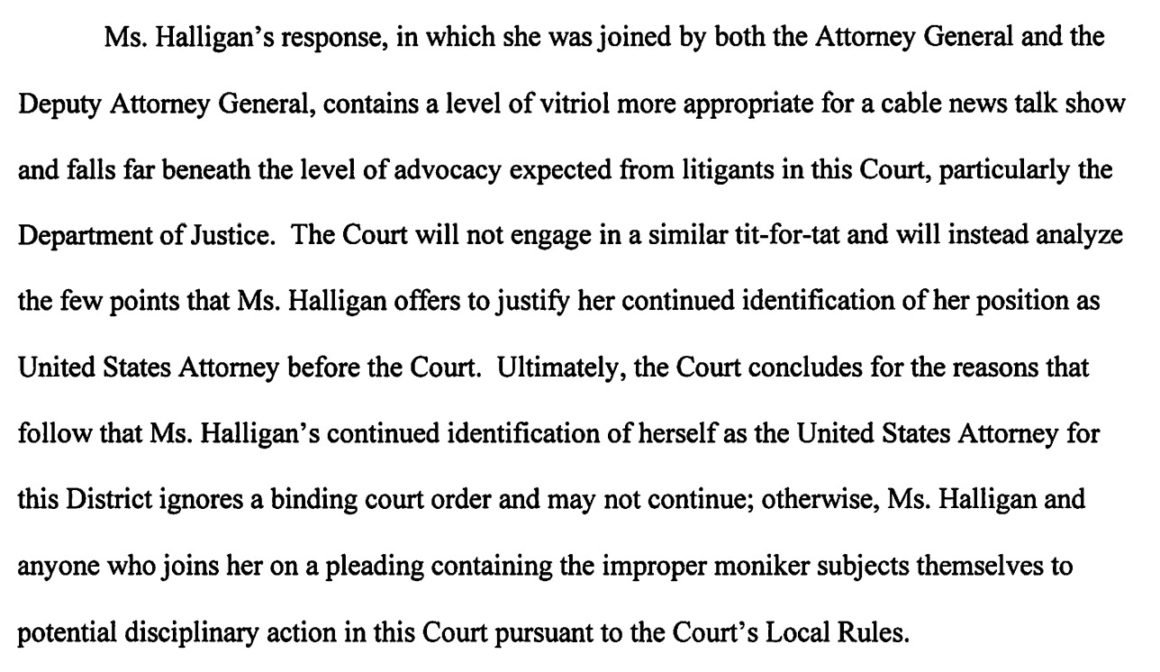 Ordering that the title be struck from filings in the case before him, Novak — citing Halligan’s “inexperience” — refrained from referring her from disciplinary action “at this time.“ And yet, he added that “should Ms. Halligan persist in ignoring Judge Currie’s Orders and this Memorandum Order in any matter before the undersigned, the Court will initiate disciplinary proceedings against Ms. Halligan and any other signatory to an offending pleading.”