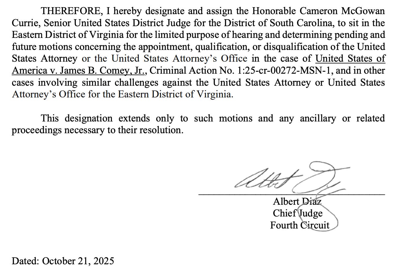 After Halligan was purportedly appointed to be the U.S. Attorney and she indicted former FBI director James Comey and New York Attorney General Letitia James, challenges to Halligan’s appointment were brought. To keep the Eastern District of Virginia judges from deciding whether the prosecutor for the district was properly appointed, Judge Albert Diaz — the chief judge of the U.S. Court of Appeals for the Fourth Circuit — appointed Judge Cameron McGowan Currie (a senior status federal judge from South Carolina) to consider and resolve the question of the validity of Halligan’s appointment.
