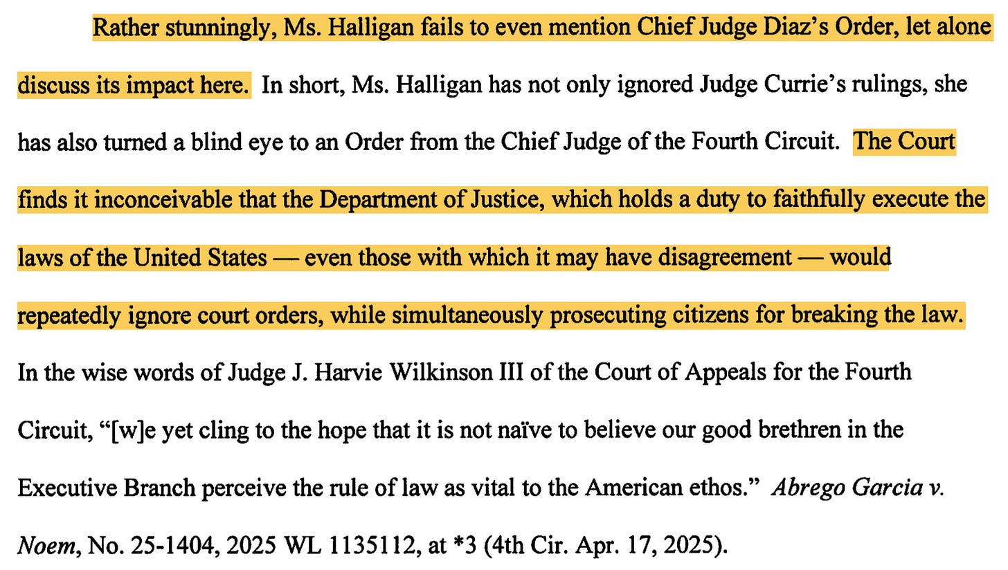 As to the substance, Novak noted incredulously that DOJ’s defense of Halligan’s continued use of the title “fails even to mention Chief Judge Diaz’s Order” — specifically the scope of Currie’s appointment and the forward-looking language in it about Currie “determining … future motions concerning the appointment, qualification, or disqualification” of Halligan.