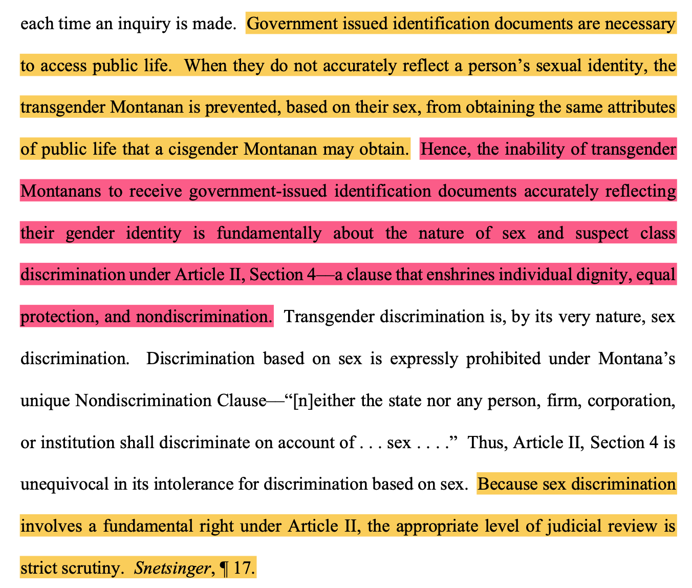 With that understanding, the court easily concluded that “the State’s position ignores that only transgender persons are discriminated against when they are not allowed to have identification documents that match their gender identity and that this constitutes discrimination based on sex, a category specifically identified in Montana’s Nondiscrimination Clause.”