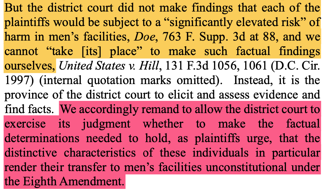 As to the merits, though, Pillard explained that the preliminary injunctions were all based on a generalized Eighth Amendment claim finding that “transgender persons are at a significantly elevated risk of physical and sexual violence relative to other inmates when housed in a facility corresponding to their biological sex.”