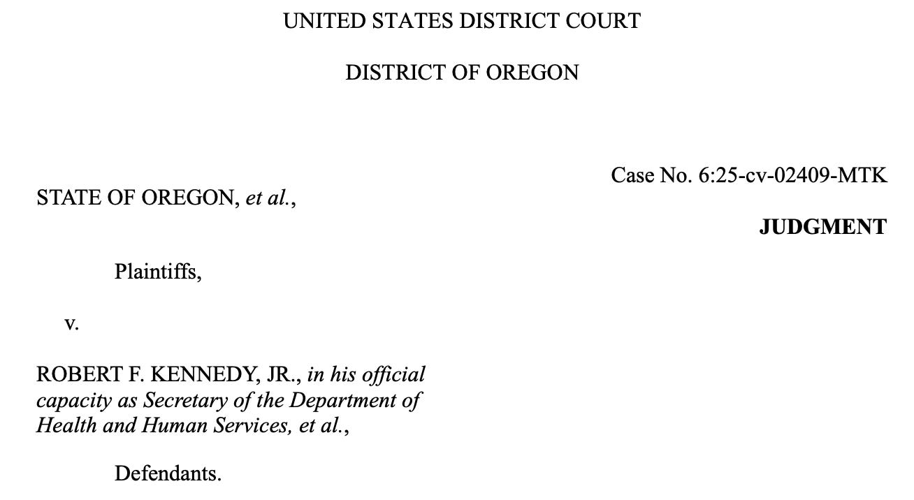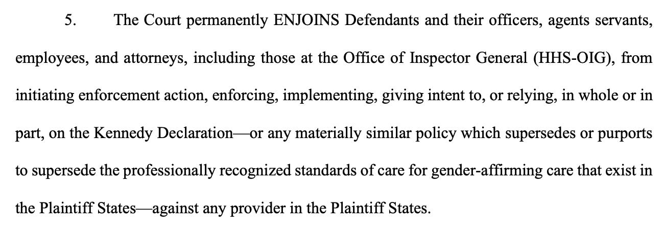 In the third case, a federal judge in Oregon found that Health and Human Services Secretary Robert F. Kennedy Jr. “unlawfully issued a declaration threatening to cut federal funding to medical providers who provided gender-affirming care to minors.”