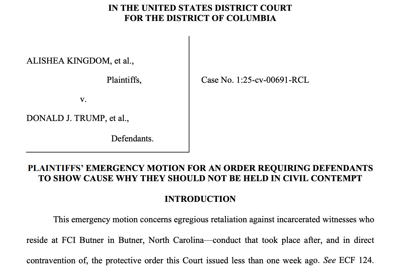 An alarming emergency motion filed on Wednesday night alleged “flagrant violations” by the Trump administration of a federal court order that it not retaliate against witnesses who are providing information to the court in a lawsuit challenging the Trump administration’s anti-trans prison policies.