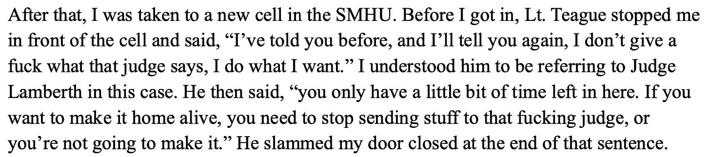 Three days later, however, Pinson alleged that a lieutenant at the facility where she is housed referred to as Lt. Teague told her, “I don’t give a fuck what that judge says, I do what I want.”