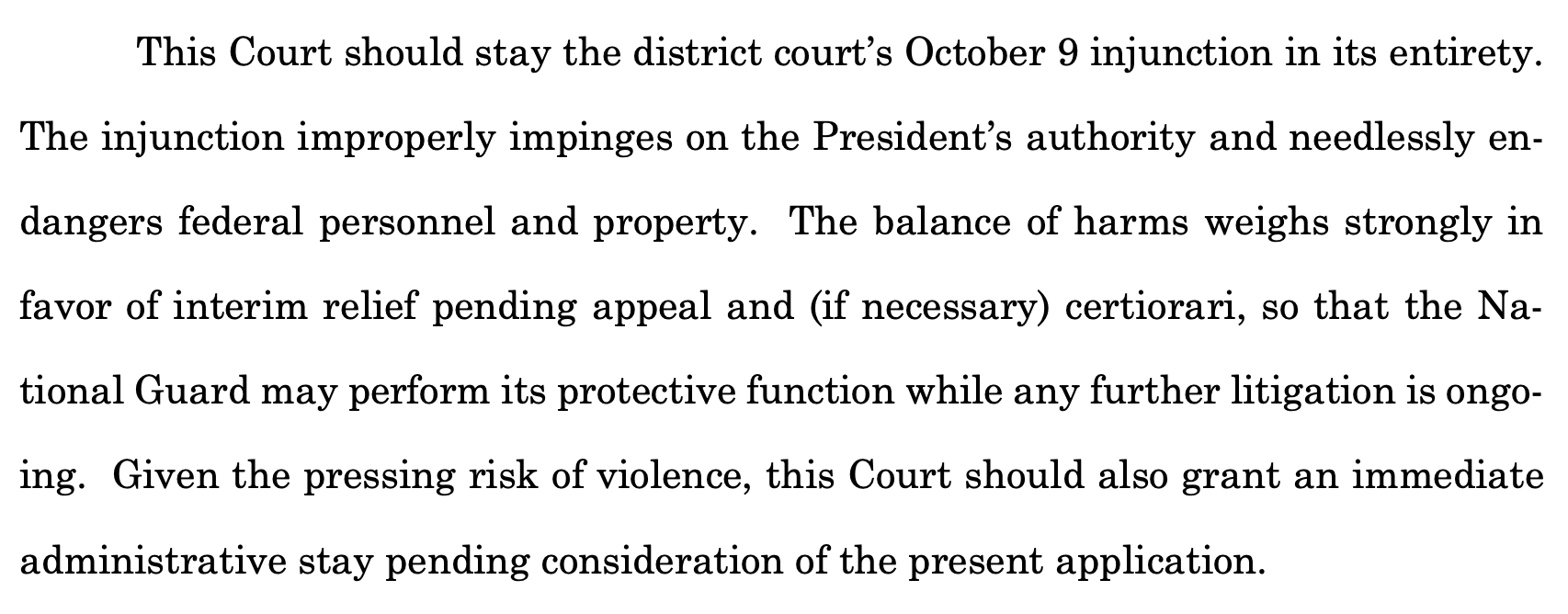 DOJ wants Perry’s TRO to be blocked “in its entirety” — allowing the deployment of Illinois National Guard and Texas National Guard in Chicago — while litigation over the case challenging Trump’s ability to deploy the National Guard is ongoing.