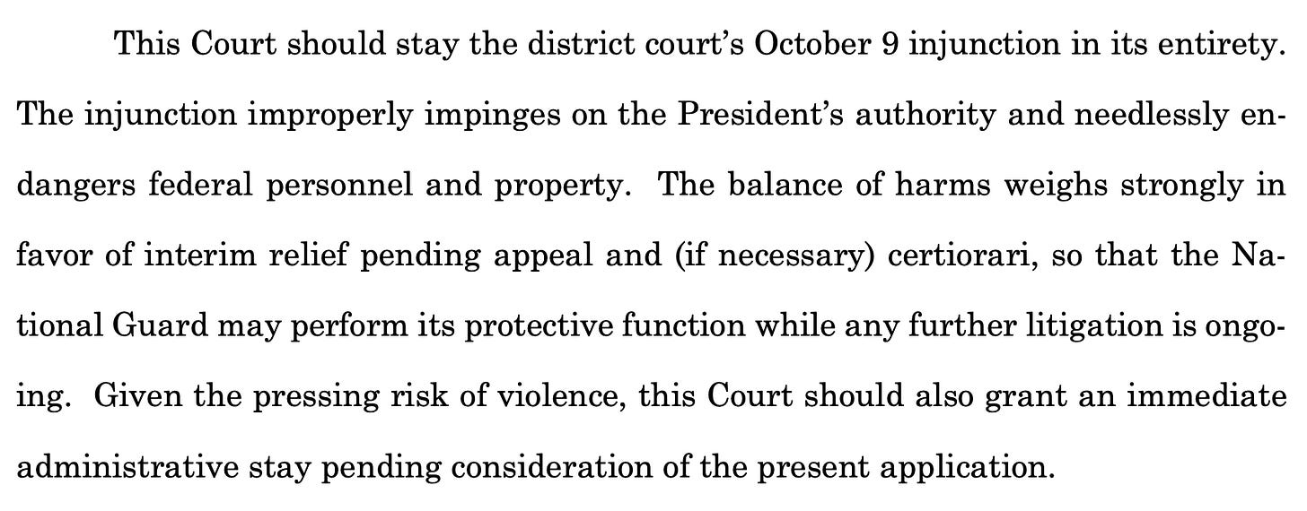 Additionally, DOJ asked for an immediate administrative stay — to “allow the Armed Forces to provide the protection that the President has directed.“