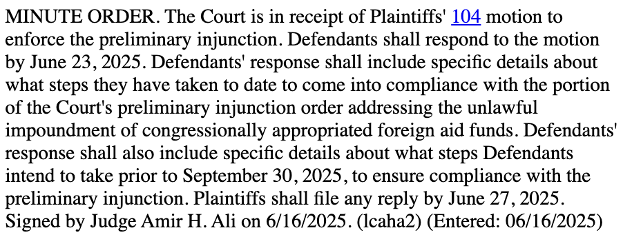 In the State Department/USAID foreign aid funding case, Ali ordered the Trump administration to provide “specific details” by next Monday, June 23, on what steps the government has taken to address “the unlawful impoundment of congressionally appropriated foreign aid funds” and what steps the government plans to take “prior to September 30, 2025” to comply with the March 10 preliminary injunction in the case.