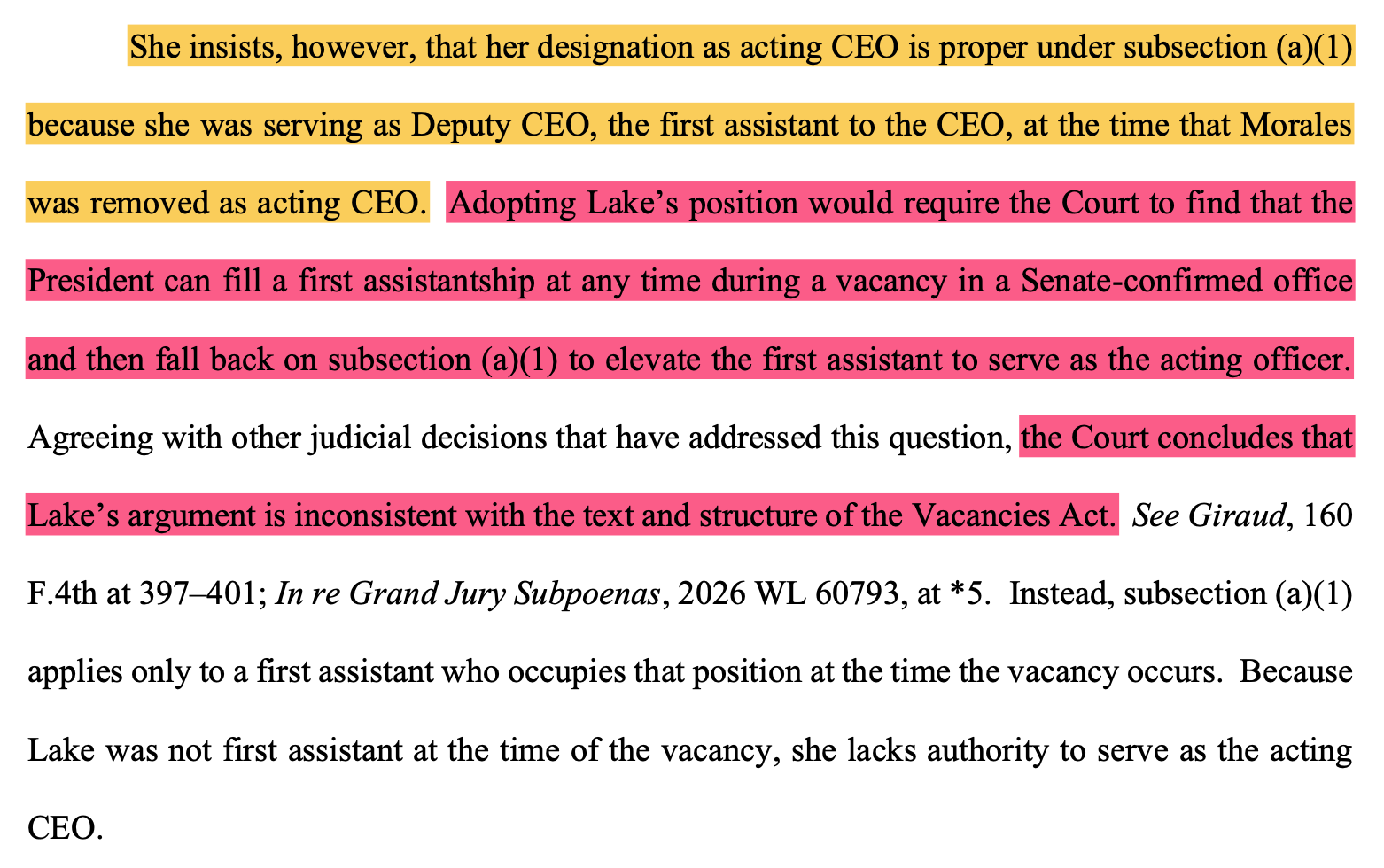 Specifically, he found that the law relied upon by the government doesn’t allow the delegation the government is claiming and, in any event, another provision in the FVRA bars it.