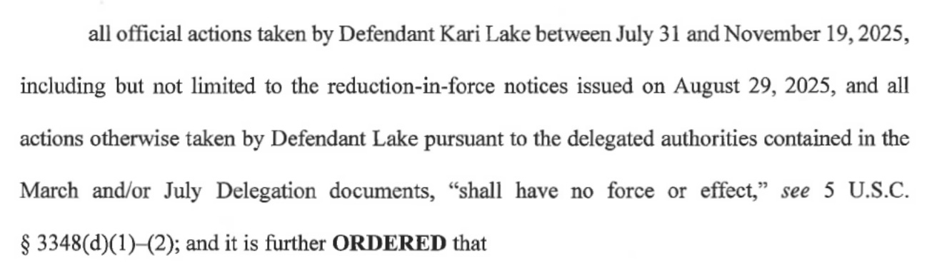 Because of that, Lamberth, a Reagan anppointee, ordered that, among other acts, Lake’s effort to put in place a Reduction in Force (RIF) across the agency is void.