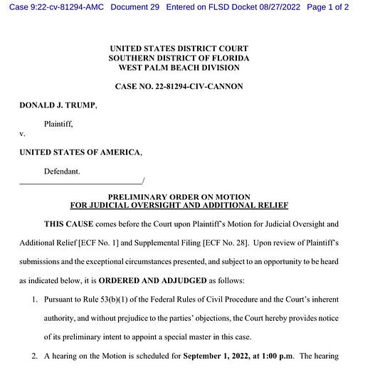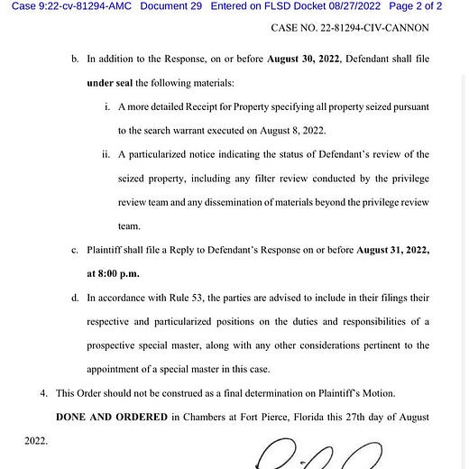 The latest news is that over the weekend, the Trump appointee (who they went to last week) issued an order that she was inclined to appoint a special master to address concerns raised by the Trump team about the Justice Department’s review of the materials seized in the search.