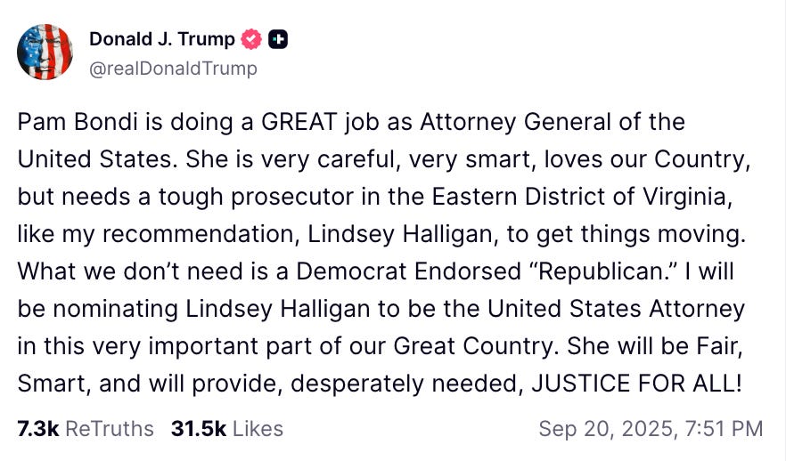 An hour later, suggesting a clean-up move after the prior two posts, Trump posted a third time to say that Bondi is “doing a GREAT job” and that he “will be nominating“ Halligan, another of his former personal lawyers, to be the U.S. Attorney for the Eastern District of Virginia: