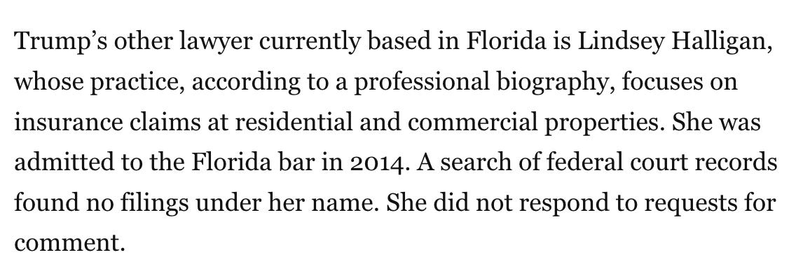 In short, none of those three permit Trump to appoint Halligan to be U.S. Attorney without Senate confirmation. And, as this Washington Post report from 2022, when she first appeared on Trump’s legal team after the Mar-a-Lago raid, suggests, Halligan is not in any way qualified to run any U.S. Attorney’s Office, let alone one home to some of the most significant national security cases in the country: