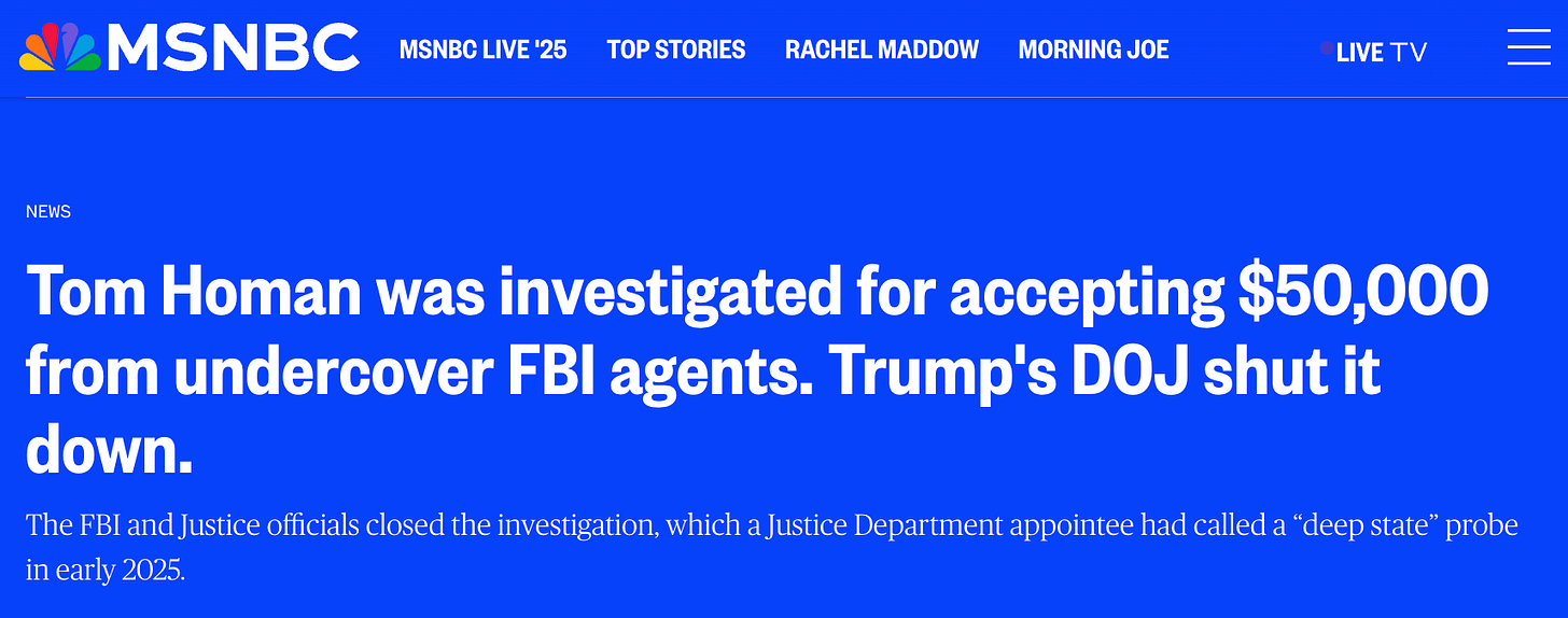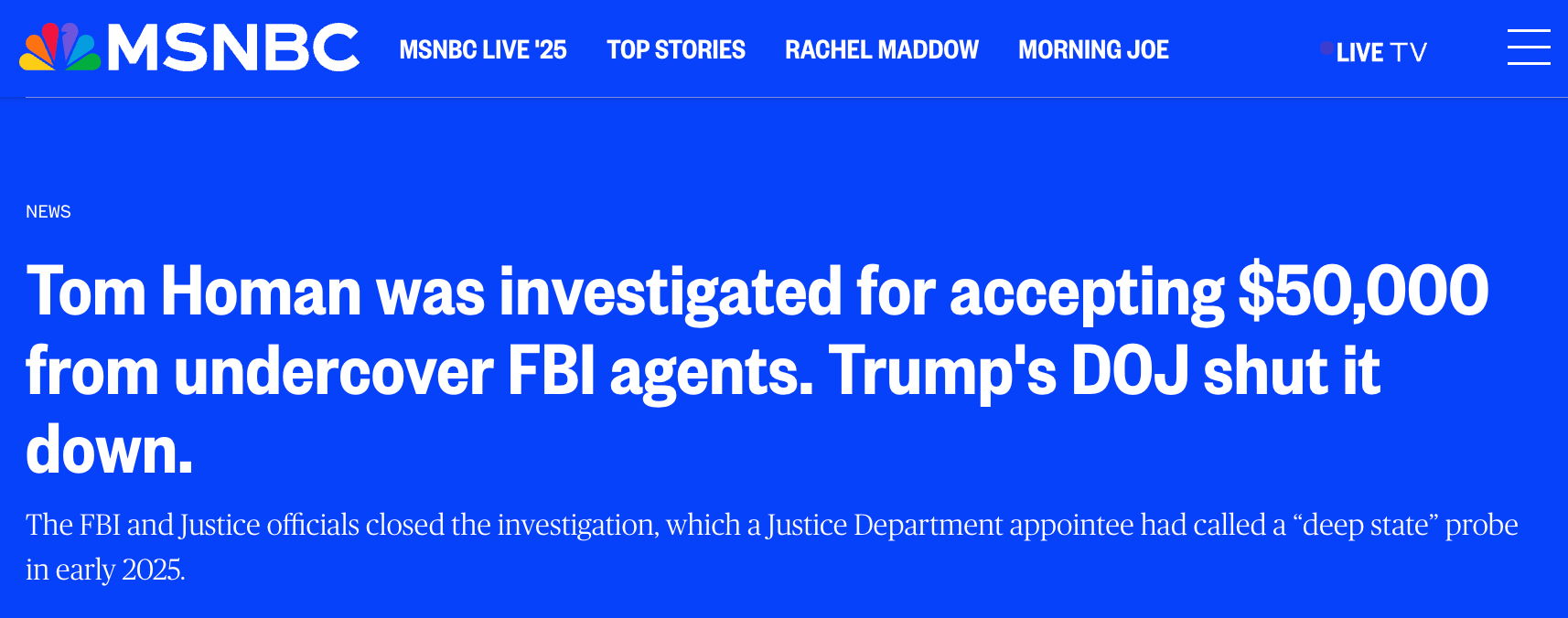In a story alleging that the Justice Department shut down an investigation of Trump “border czar” Tom Homan despite the FBI having earlier recorded Homan “accepting $50,000 in cash” from agents “posing as business executives,” veteran journalists Carol Leonnig and Ken Dilanian reported at MSNBC: