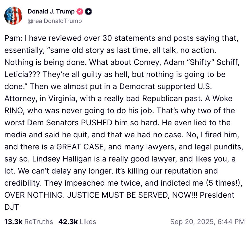 On Saturday evening, as Kyle Cheney reported, Trump published a post on Truth social directed to “Pam” — Bondi — in which he claimed to have fired the unnamed Siebert; suggested it was because he “said … that we had no case,” after having referenced targets of his retributive ire, including former FBI Director James Comey, Sen. Adam Schiff, and New York Attorney General Letitia James; and wrote that “Lindsey Halligan … likes” Bondi “a lot,” in telling Bondi, “We can’t delay any longer ….”