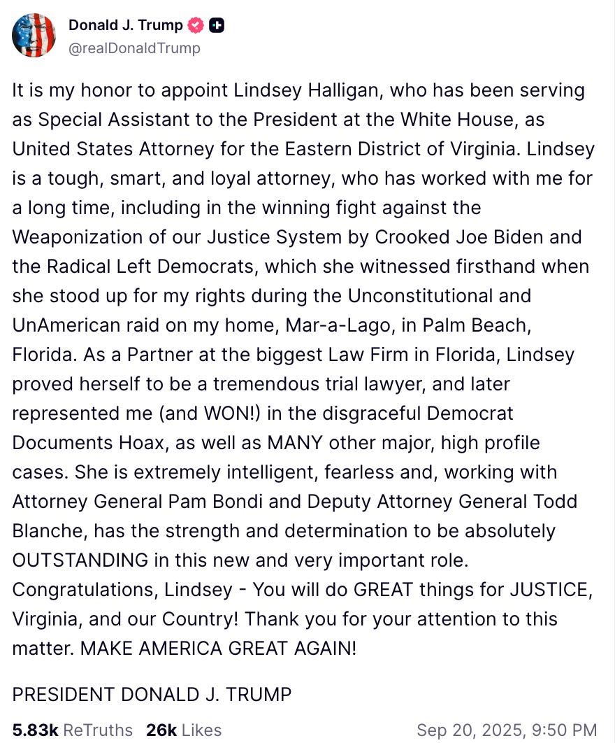 Two hours after that, in a fourth post, Trump claimed that he was “appoint[ing]” Halligan “as” U.S. Attorney for the Eastern District of Virginia, although he can’t do that.