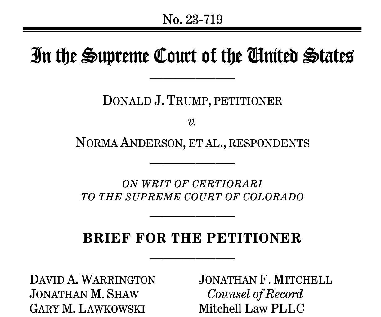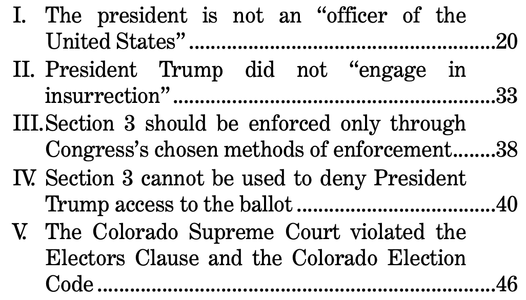 I’ll go into in more detail through each of the arguments once we get the responsive briefs — from the Colorado voters and secretary of state and those non-parties supporting the Colorado Supreme Court’s decision — on (or before) Jan. 31.