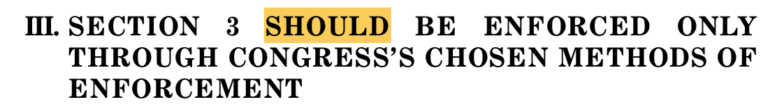While the other four are conclusions that Mitchell and Trump’s other lawyers argued the Colorado court definitively got wrong — “is not,” “did not,” “cannot,” and “violated” — even Mitchell hedged with a “should” in this part. Instead of stating that Section 3 of the Fourteenth Amendment can only be enforced as Congress chooses, the brief asserted that there are “compelling reasons” why the court should rule that way.
