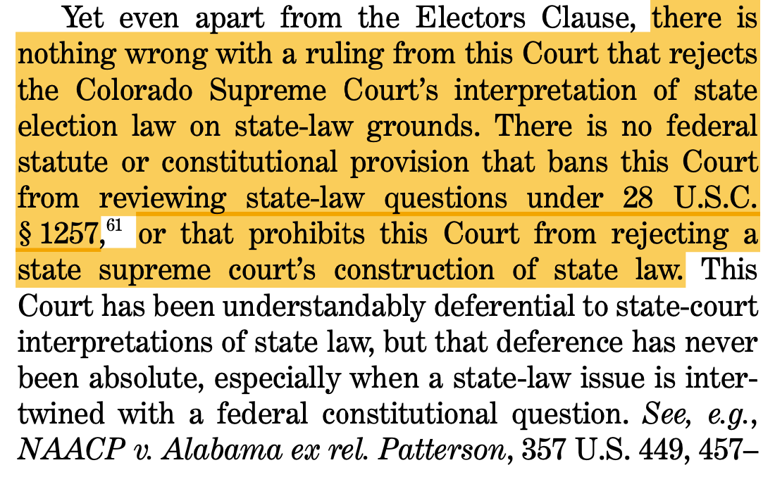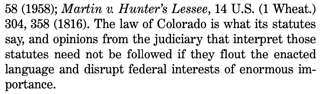 Additionally, at the conclusion of the brief, Mitchell and the other lawyers told the U.S. Supreme Court that there is “nothing wrong” with it ignoring the Colorado Supreme Court’s interpretation of Colorado law if it thinks the state court got it wrong. And though the brief asserted that this is “especially” so when “intertwined” with a federal constitutional issue, it claimed that was not even necessary for such an act.