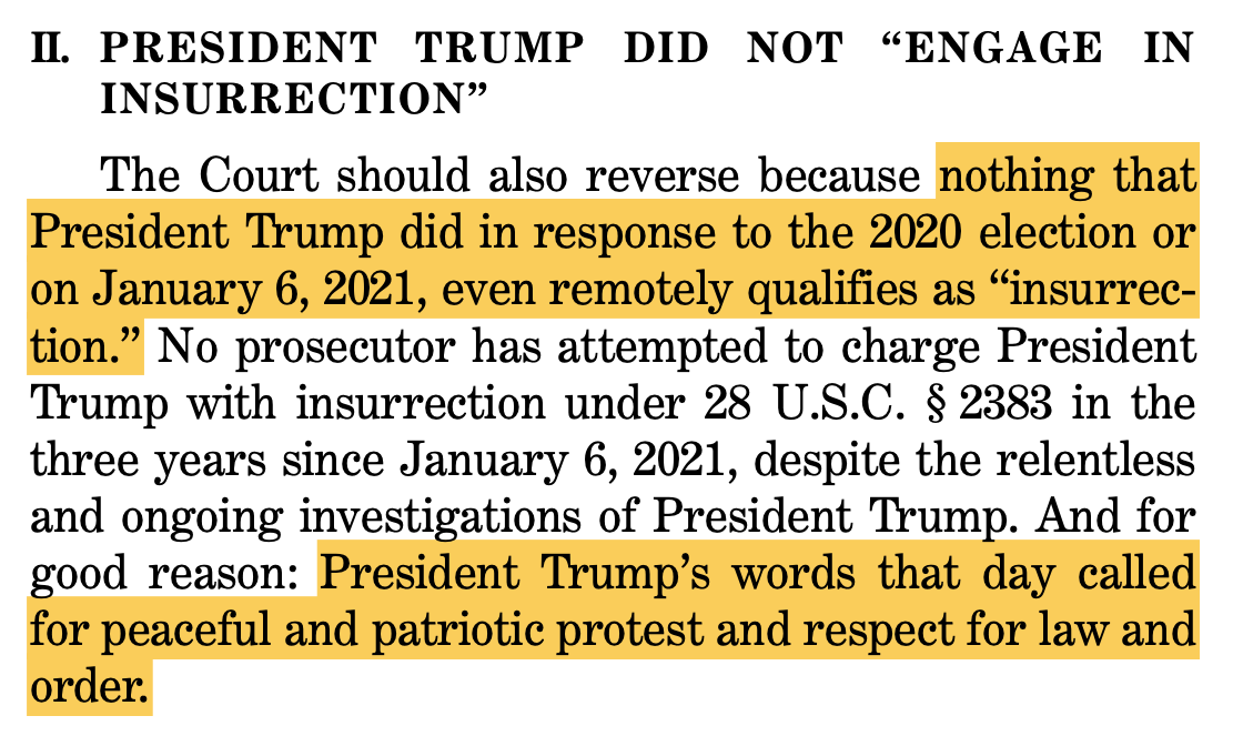 We have seen several arguments claiming that Trump did not “engage in insurrection” made in the months since the Section 3 case has been being broadly advanced, including in Thursday’s brief, but this “Trump as peacemaker” argument, specifically, is such an obviously bad-faith one that I was surprised to see it being advanced to the justices. But, here we are — and here Mitchell is.